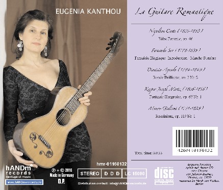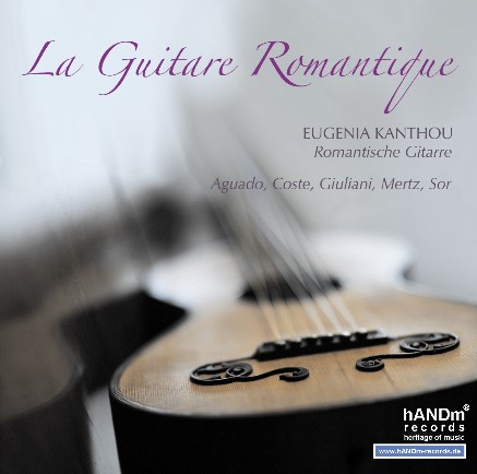 Wir freuen uns, Ihnen unsere neueste CD-Produktion "La Guitare Romantique" mit der Berliner Gitarrenvirtuosin Eugenia Kanthou überreichen zu dürfen. Frau Professor Kanthou spielte auf einem historischen Instrument, einer Wiener Biedermeiergitarre, ca. aus dem Jahr 1820, selten zu hörende Werke von Napoléon Coste, Fernando Sor, Dionisio Aguado, Kaspar Joseph Mertz und Mauro Giuliani ein. Dazu die Künstlerin selbst: „Als ich vor vielen Jahren eine schöne Wiener Biedermeiergitarre als Ausgleich für eine niedrige Konzertgage bekam, konnte ich noch nicht ahnen, welcher Klang in diesem ramponierten, aber sympathischen Wrack schlummerte. Umhüllt von der geheimnisvollen Aura eines die Jahrhunderte überdauernden Zeitzeugens sollte sie noch eine ganze Weile an meiner Wand schweigen, bis in mir, die immer der modernen Gitarre die Priorität gegeben hatte, das Interesse und die Neugier erweckt wurden. So ließ ich endlich die Gitarre restaurieren.